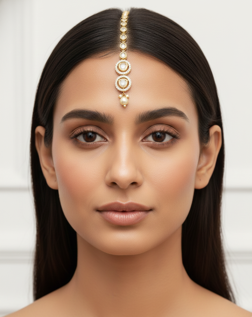 A graceful blend of romance and tradition, the Amora Heartline Pearl Maangtika features a delicate gold-toned chain accented with bezel-set crystal rounds, leading to heart-shaped motifs encrusted with fine stones. Finished with a soft pearl drop, this design adds a subtle glow to the forehead while maintaining an elegant, elongated silhouette.