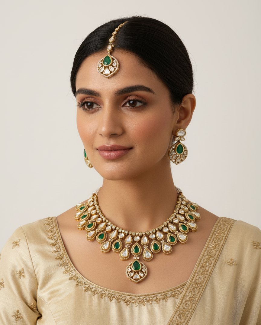 The Elysian Verde Set captures the essence of divine grace and regal allure. Crafted with meticulous precision, this masterpiece features an opulent arrangement of emerald-green teardrop stones framed in radiant Kundan and uncut polki detailing. The harmonious blend of gold tones and lush green hues creates a timeless symphony of elegance — complemented by matching earrings and a majestic maang tikka that complete the royal ensemble.