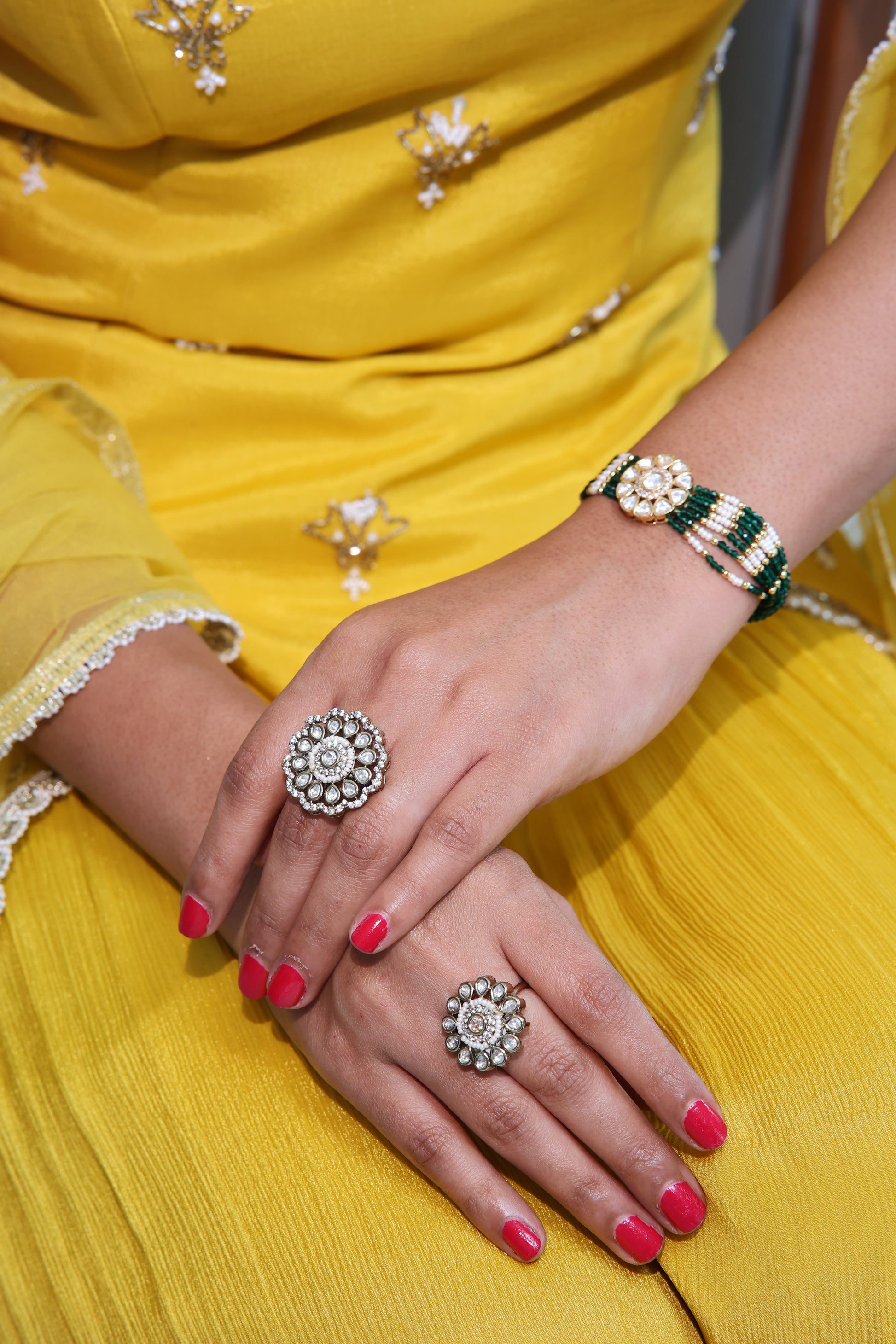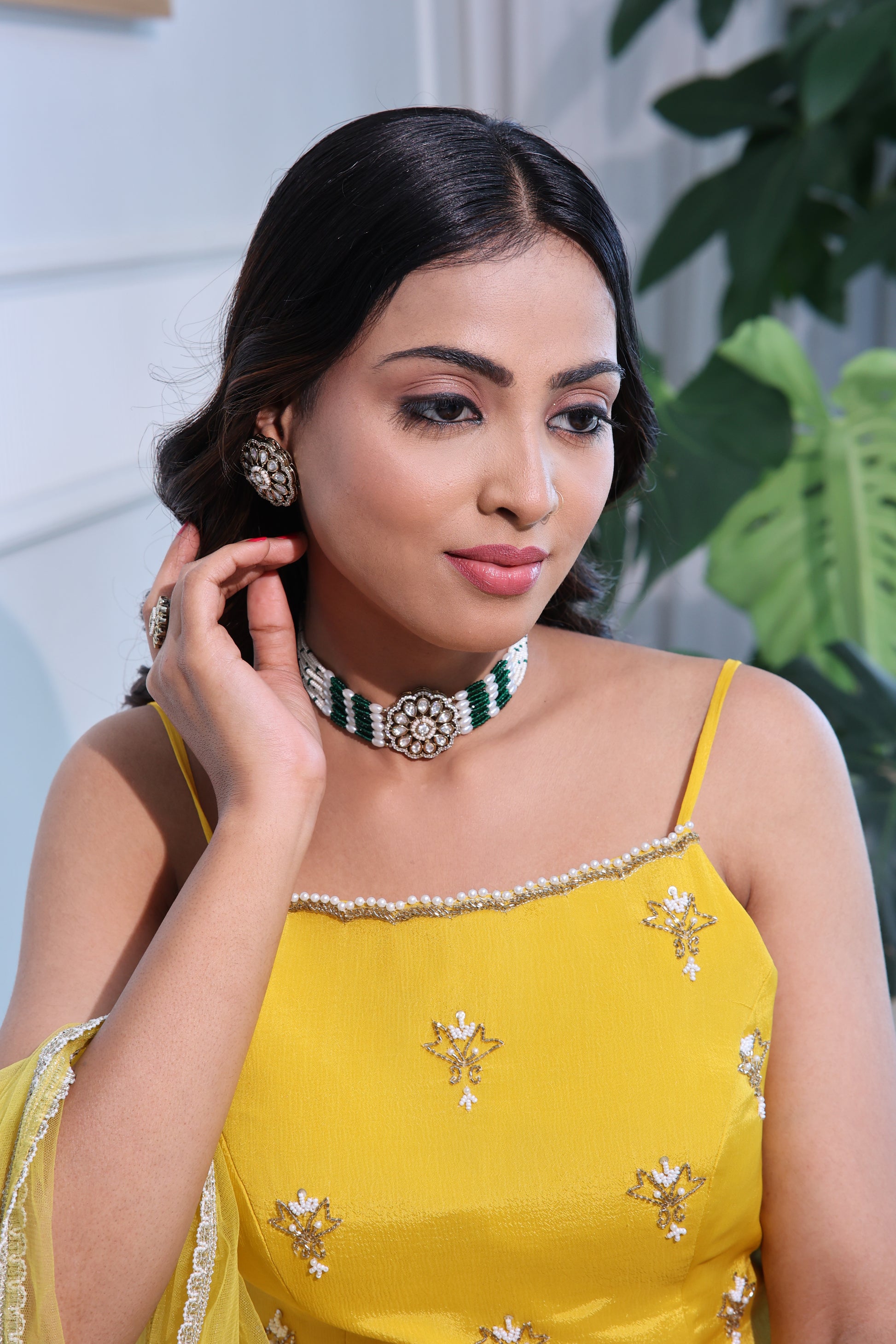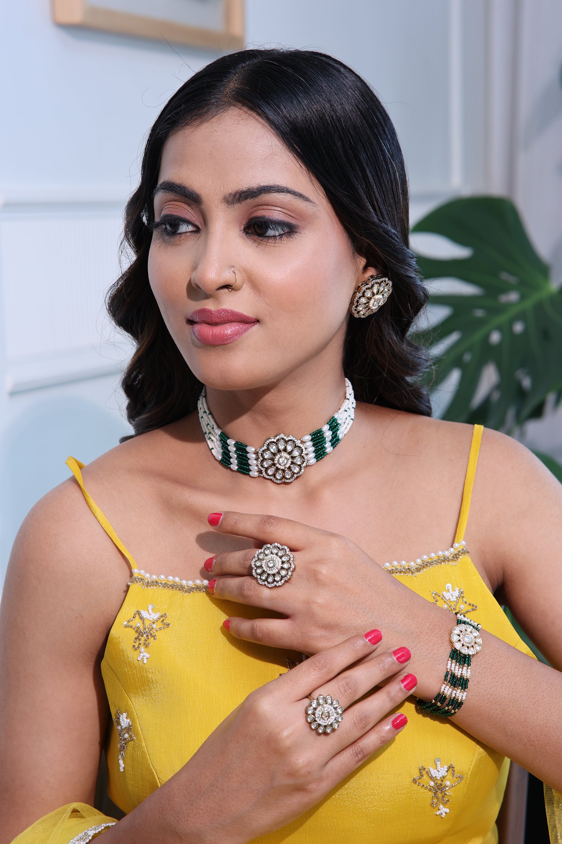 The vivid yellow ensemble beautifully enhances the green and gold tones of the jewelry, creating a look that’s both refreshing and royal. Perfect for festive gatherings, haldi functions, or daytime celebrations, this set embodies effortless glamour with a touch of tradition.