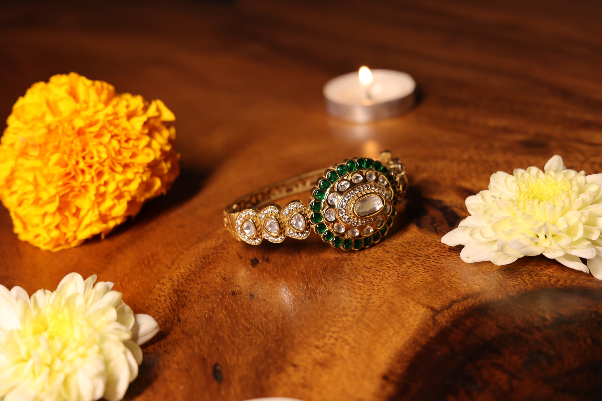 Pair this cuff with a traditional silk saree, velvet lehenga, or even an embroidered Indo-Western gown to elevate your festive or wedding look. Its bold yet elegant presence makes it a perfect companion for both day and evening occasions.