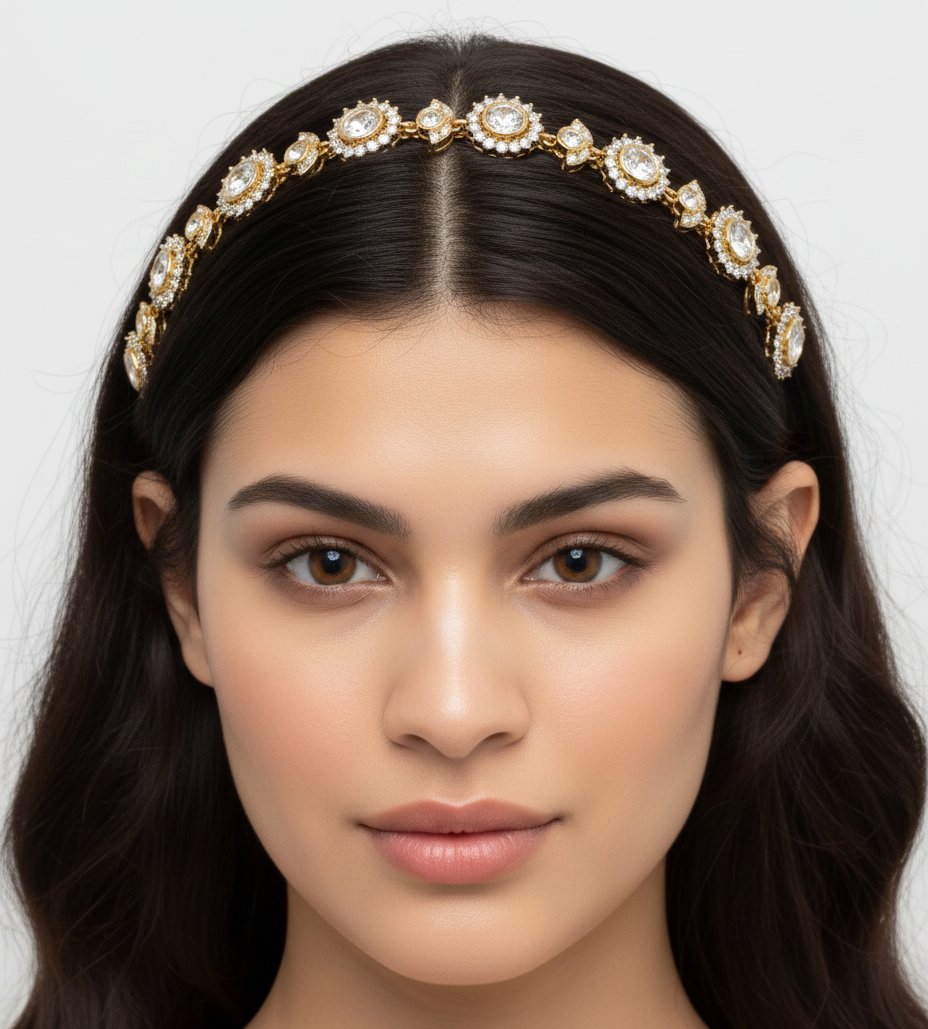 A timeless Sheeshpatti crafted with a sequence of luminous round Polki centres, each framed with a halo of sparkling stones that mimic the brilliance of heritage Kundan workmanship. Alternating between floral-inspired rounds and delicate tri-petal motifs, the design creates a rhythmic flow of elegance across the hairline. Finished in antique gold with meticulous detailing, this piece exudes regal charm while remaining lightweight and comfortable for long wear.
