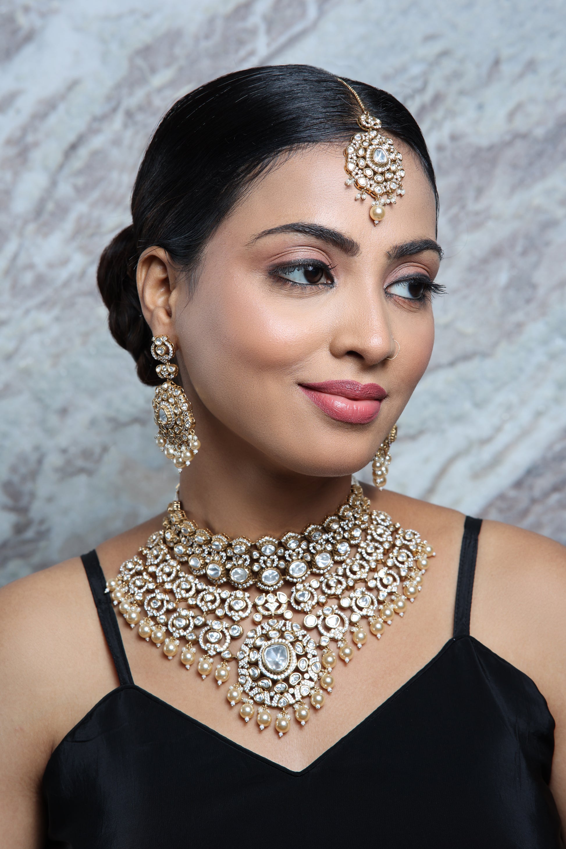 Complemented by statement earrings and a matching maangtika, this ensemble adds an air of timeless elegance to bridal and festive occasions. The blend of gold tones, mirror-polished kundan, and soft pearl drops captures the essence of heritage luxury.