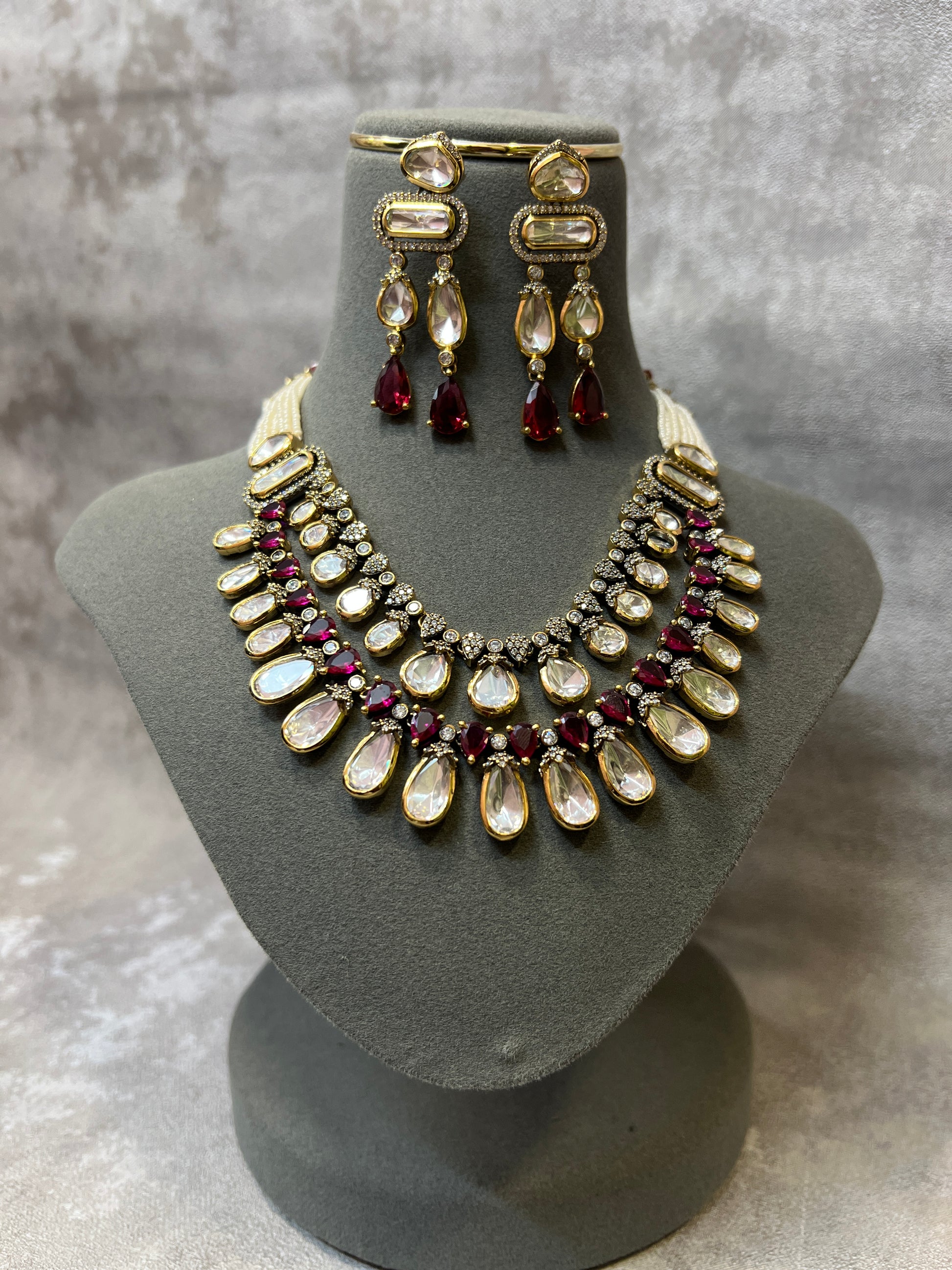 The Royale Radiance Kundan Set embodies timeless elegance with its handcrafted uncut kundan stones and lustrous pearl strands. Each teardrop stone is bordered with fine crystal accents, gracefully complemented by deep gemstone highlights available in emerald green and ruby red. The design radiates regal grandeur, perfect for festive and wedding ensembles.