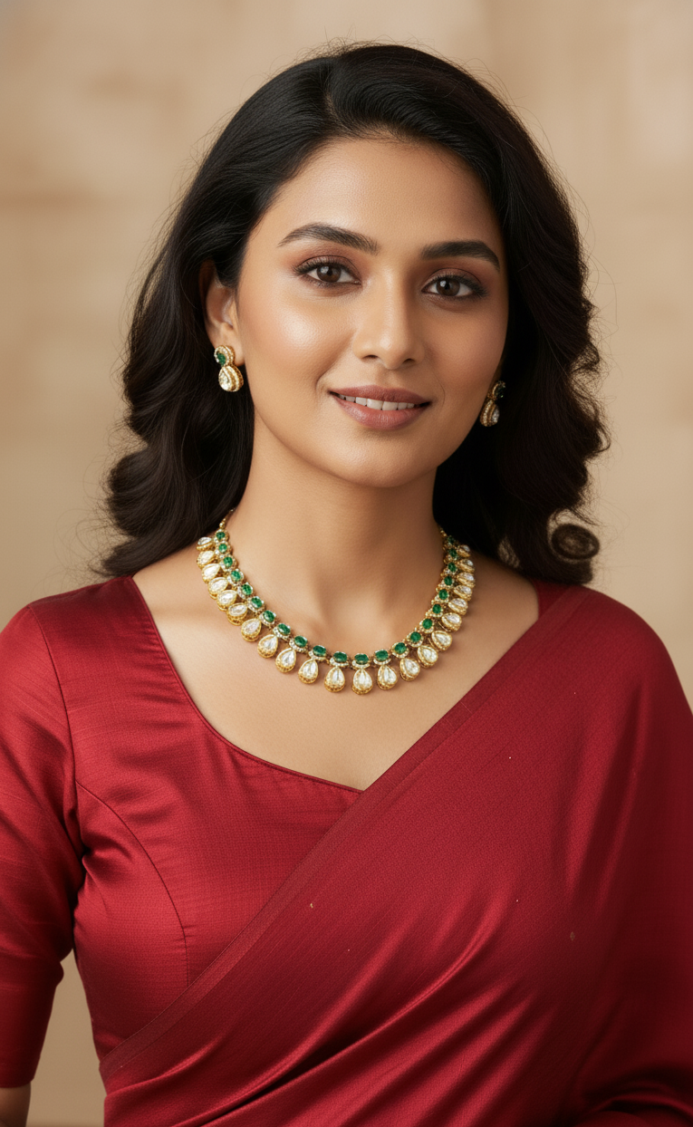 A vision of regal allure, the Verdantia Royale Ensemble Set captures the essence of timeless Indian grandeur. The necklace features a graceful cascade of teardrop polki stones framed in antique gold, interlinked with rich emerald-green gems that add depth and majesty. Matching earrings complete the look with understated sophistication.